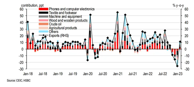 HSBC cũng đã từng cảnh báo Việt Nam ở thế “đứng mũi chịu sào” trước tình hình kinh tế chậm lại ở Mỹ, vốn là điểm đến lớn nhất đối với hàng xuất khẩu của Việt Nam chiếm tỷ trọng 30%. Dù vậy, ngoại lệ duy nhất nằm ở mảng điện thoại và linh kiện liên quan, tổng kim ngạch xuất khẩu từ đầu năm tới giờ đã tăng gần 8% so với cùng kỳ năm trước. Đặt trong chu kỳ phát hành điện thoại thông minh của Samsung, kết quả này nhiều khả năng đạt được là nhờ sự ra mắt của dòng sản phẩm "đinh" Galaxy S23 từ ngày 17/2, với số lượng đặt trước cao hơn hẳn so với dòng Galaxy S22 trước đây.