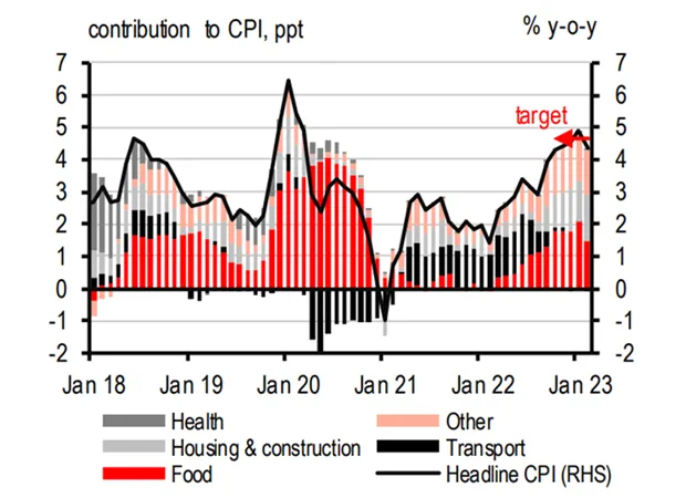 Đối với lạm phát, chuyên gia HSBC cho biết mặc dù lạm phát toàn phần tháng Hai ở mức 4,3% so với cùng kỳ năm trước, thấp hơn mức lạm phát mục tiêu 4,5% của Ngân hàng Nhà nước Việt Nam đặt ra cho năm 2023 nhưng Việt Nam vẫn cần cẩn trọng khi xem xét các diễn biến.