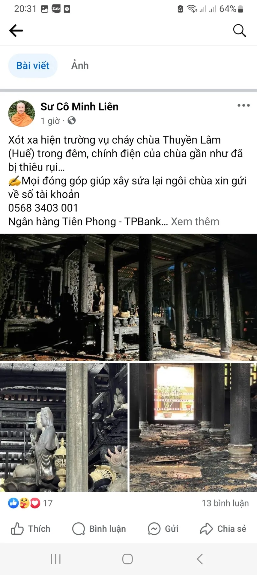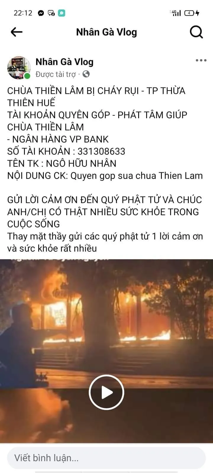 Tuy nhiên, không hiểu vì lý do gì mà từ tối qua đến sáng nay 25-6, liên tiếp trên mạng xã hội Facebook xuất hiện các trang: Sư Cô Minh Liên, Nhân Gà Vlog… đăng tải hình ảnh, video hiện trường vụ cháy chùa Thuyền Lâm xảy ra vào tối 23-6, kèm theo tài khoản ngân hàng kêu gọi, tiếp nhận quyên góp kinh phí ủng hộ xây sửa lại chùa Thuyền Lâm.