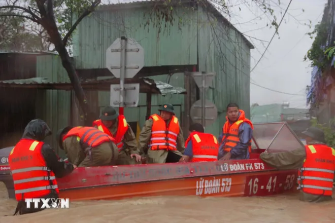 Cán bộ, chiến sỹ Lữ đoàn 573 tiếp cận, hỗ trợ người dân ở khu vực bị ảnh hưởng bởi mưa lũ. (Ảnh: Đình Quân/TTXVN)