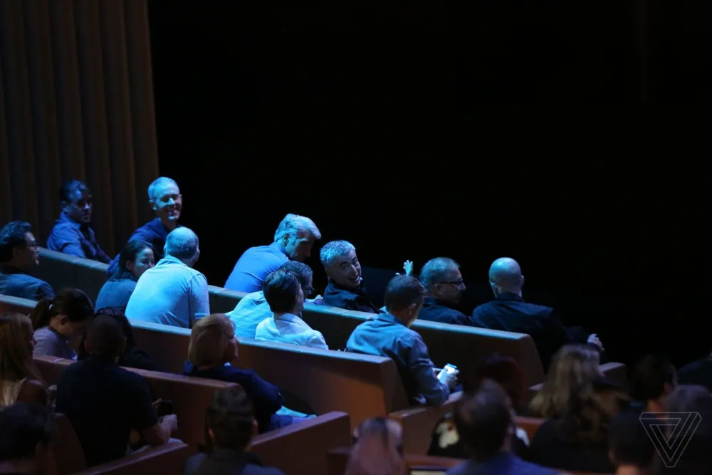 23h40: Hội trường đã có sự xuất hiện của "thiên tài thiết kế" Jony Ive, Phó tổng giám đốc bộ phận thiết kế hiện tại của Apple (đầu trọc mặc áo xanh dương)