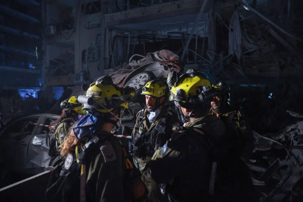 Các thành viên của lực lượng an ninh Israel kiểm tra một địa điểm bị tên lửa bắn từ Iran tấn công, tại Ramat Gan, ngoại ô Tel Aviv, vào thứ sáu. JIJI
