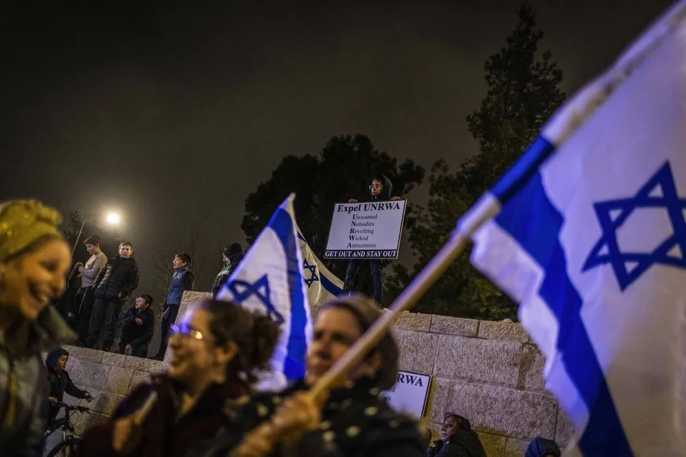 Các nhà hoạt động cánh hữu Israel tham gia cuộc biểu tình bên ngoài trụ sở UNWRA tại Jerusalem, kêu gọi chấm dứt hoạt động của tổ chức này, sau các báo cáo rằng nhân viên UNWRA đã tham gia vào cuộc tấn công của Hamas vào ngày 7 tháng 10.