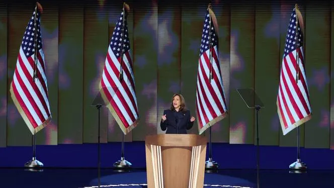 Kamala Harris phát biểu tại đại hội đảng Dân chủ vào tháng 8. Kể từ đó, số phiếu của bà không cải thiện nhiều so với Donald Trump.