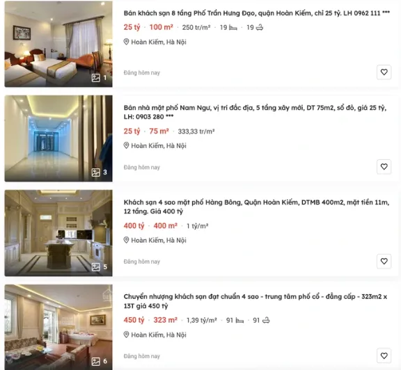 Tương tự, một khách sạn khác ở phố Hàng Bông, quận Hoàn Kiếm cũng đang được rao bán với giá 497 tỷ đồng. Theo thông tin rao bán, khách sạn này có diện tích 348m2, được xây dựng 13 tầng, gồm 90 phòng đẳng cấp tiêu chuẩn 5 sao. Ngoài thông tin "sổ đỏ chính chủ", người đăng thông tin rao bán còn cho hay, doanh thu của khách sạn là 3,5 tỷ đồng/tháng.
