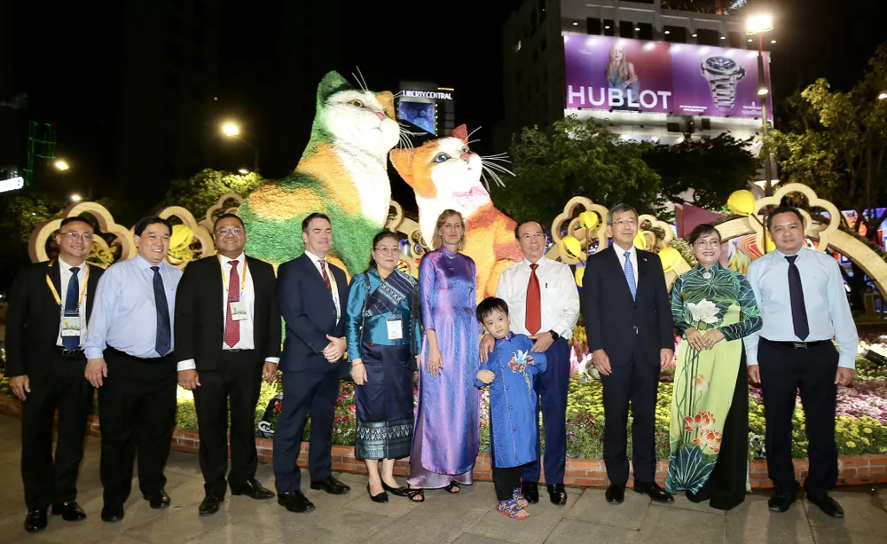 Các đại biểu chụp hình lưu niệm tại Đường hoa tết Quý Mão 2023. Ảnh: DŨNG PHƯƠNG