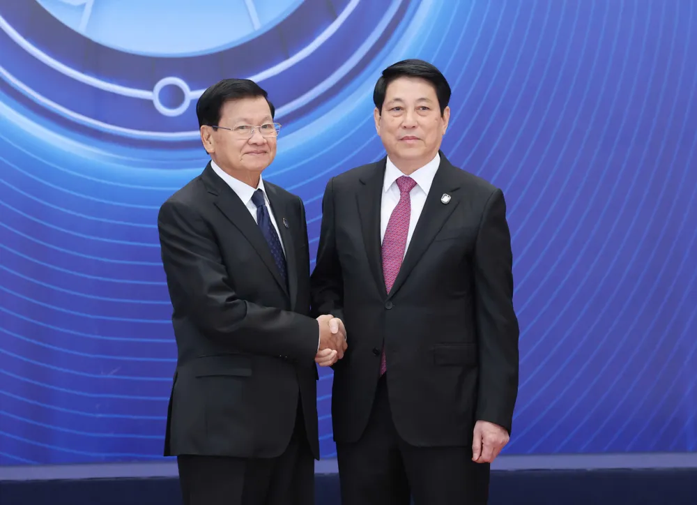 Chủ tịch nước Lương Cường và Tổng Bí thư, Chủ tịch nước Lào Thongloun Sisoulith tới dự lễ mở ký Công ước Liên hợp quốc về chống tội phạm mạng (Công ước Hà Nội), sáng 25-10. Ảnh: QUANG PHÚC
