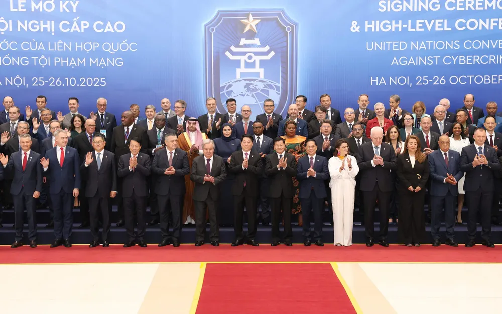 Chủ tịch nước Lương Cường chụp ảnh chung cùng các trưởng đoàn tới dự lễ mở ký Công ước Liên hợp quốc về chống tội phạm mạng (Công ước Hà Nội), sáng 25-10. Ảnh: QUANG PHÚC