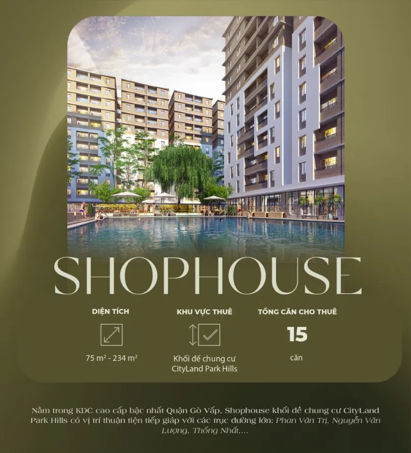 3. Shophouse: Nằm trong khu dân cư cao cấp bậc nhất quận Gò Vấp, Shophouse khối đế chung cư CityLand Park Hills có vị trí thuận tiện, tiếp giáp với các trục đường lớn: Phan Văn Trị, Nguyễn Văn Lượng, Thống Nhất,...
