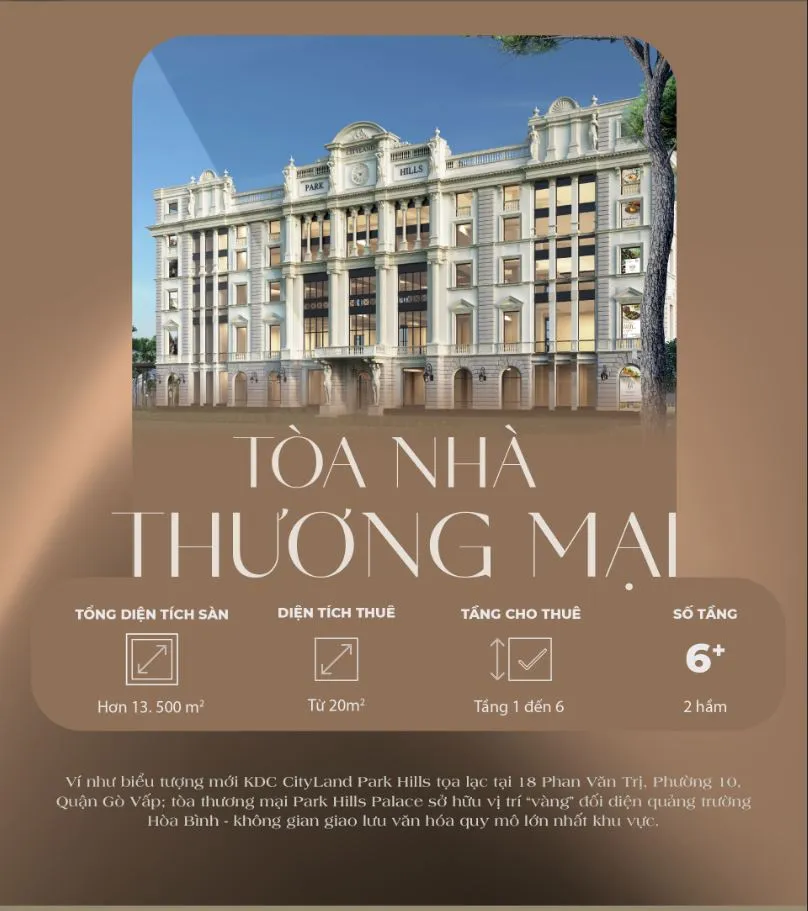 1. Tòa nhà Park Hills Palace: Được ví như biểu tượng mới của KDC CityLand Park Hills tọa lạc tại 18 Phan Văn Trị, phường 10, quận Gò Vấp; tòa nhà thương mại sở hữu vị trí “vàng” đối diện quảng trường Hòa Bình - không gian giao lưu văn hóa quy mô lớn nhất khu vực quận Gò Vấp.