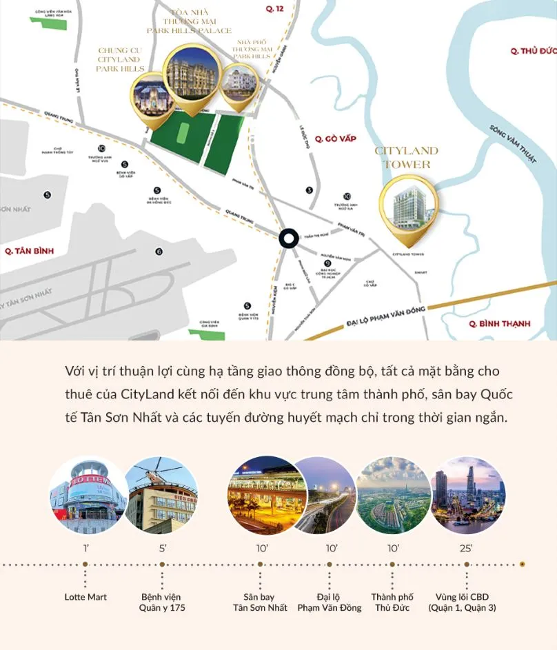 Bên cạnh đó, quận Gò Vấp sở hữu vị trí giao thương thuận tiện, là cửa ngõ kết nối trung tâm với các khu vực lân cận như Bình Dương, Đồng Nai, Tây Ninh… qua trục lộ chính nhiều đường xe và tuyến tàu hoả Bắc Nam. Các doanh nghiệp hoạt động tại đây có thể dễ dàng tiếp cận thị trường và thuận lợi mở rộng phạm vi kinh doanh.Đơn vị quản lý vận hành chuyên nghiệp: CityLand Group không chỉ là chủ đầu tư mà còn là đơn vị quản lý và vận hành chuyên nghiệp. Với đội ngũ quản lý nhiều năm kinh nghiệm trong việc vận hành cho thuê mặt bằng thương mại, CityLand Group đã phục vụ và làm hài lòng hàng trăm khách hàng cùng những giao dịch ký kết thành công trong 20 năm qua.