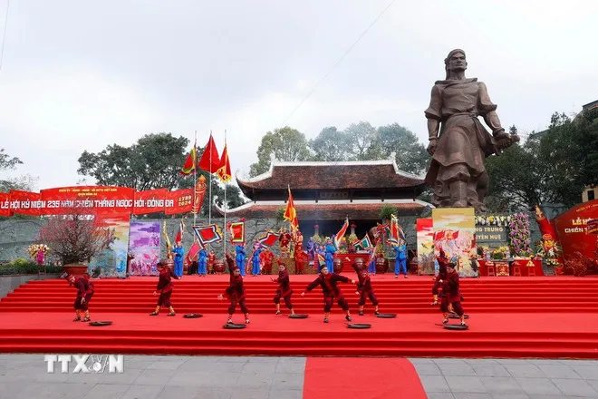 Chương trình biểu diễn nghệ thuật màn Sử thi mùa xuân Kỷ Dậu 1789 do các nghệ sỹ Nhà hát Tuồng Trung ương biểu diễn tại Lễ hội Gò Đống Đa năm 2024. (Ảnh: Minh Quyết/TTXVN)