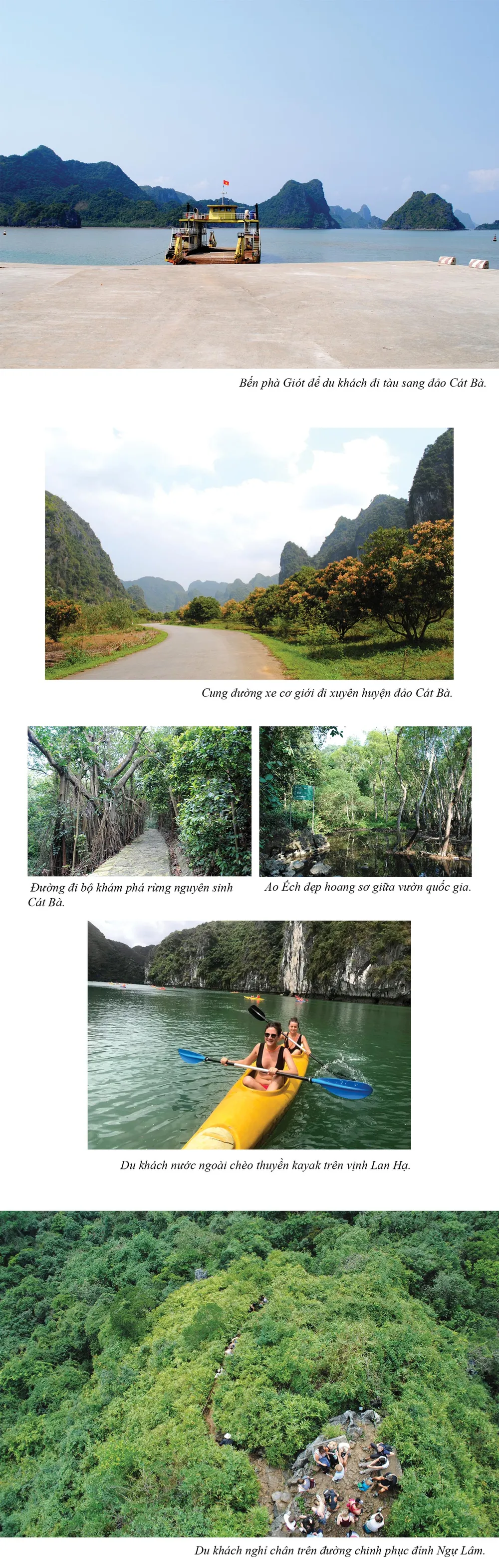 Từ trung tâm TP hoa phượng đỏ Hải Phòng cách Thủ đô Hà Nội khoảng 120km, chúng tôi tìm đường ra cầu đường Tân Vũ - Lạch Huyện. Đây là cây cầu vượt biển dài và hiện đại nhất Việt Nam, khánh thành năm 2017. Hành trình trên cầu vượt qua vùng biển xanh biếc và xuyên đảo Cát Hải, đưa chúng tôi thẳng đến bến phà Giót. Từ phà Giót, du khách có thể nhìn thấy rõ những mảng xanh bao la của thảm thực vật trên huyện đảo Cát Bà phía trước.