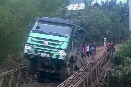 (ĐTTCO) - Cầu Quần thuộc địa phận huyện Văn Yên, tỉnh Yên Bái đã bị sập mặt cầu, dầm dọc, dầm ngang bị biến dạng do xe quá tải hơn 4 lần tải trọng qua cầu.