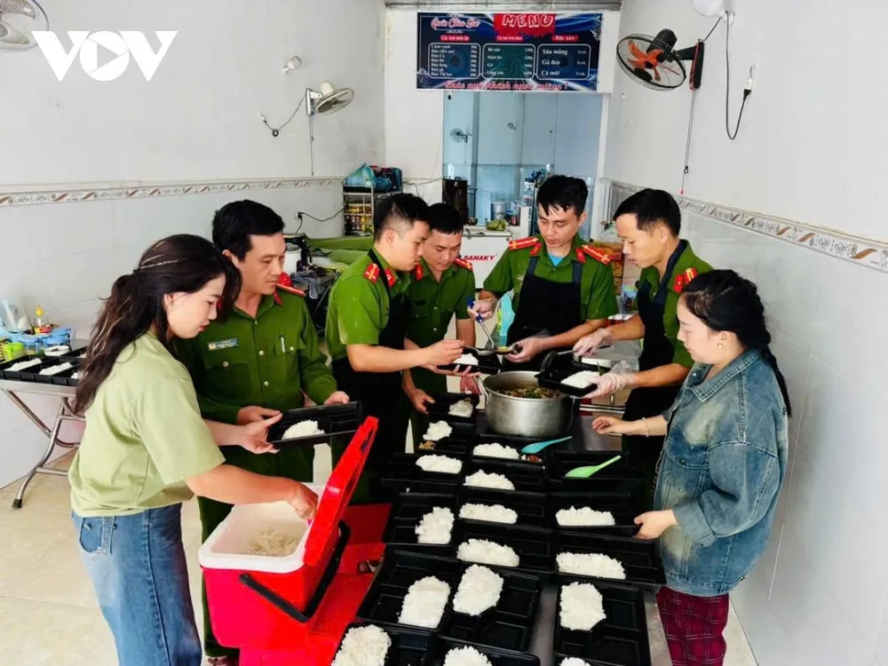 Công an xã Na Ngoi cùng người dân nấu cơm tiếp tế cho bà con nhân dân và lực lượng Công an xã Mỹ Lý