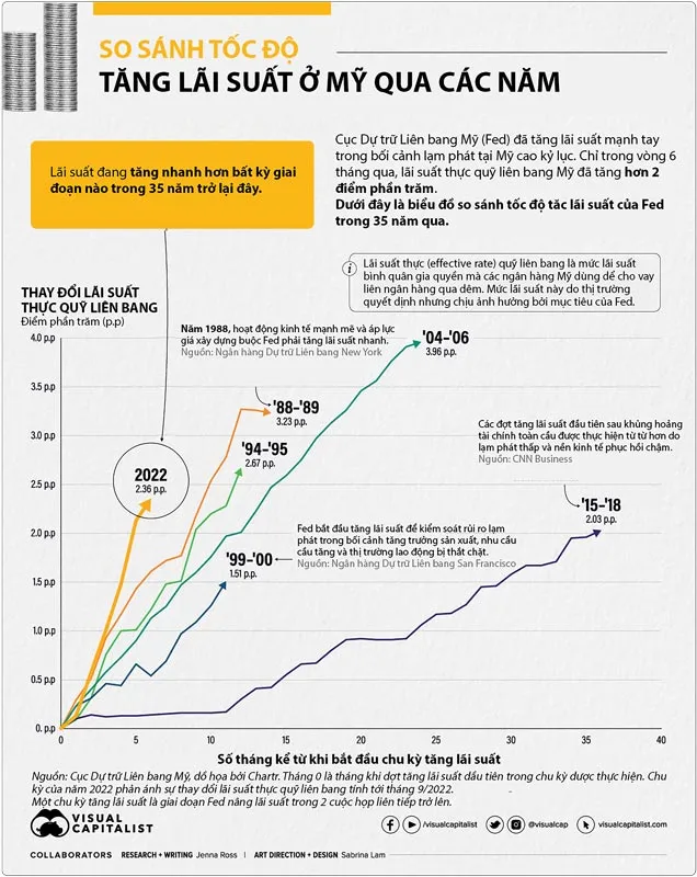 Thực ra Fed đã đưa ra thông điệp siết chính sách tiền tệ từ cuối năm 2021, nhưng không ai ngờ Fed lại thắng gấp đến vậy. Tốc độ tăng lãi suất của Fed nhanh nhất trong vòng 35 năm qua, nhanh hơn cả cú siết lãi suất cuộc khủng hoảng dot-com 1999-2000. Điều này khiến SP500 và Nasdaq có thời điểm chạm mức giảm sâu nhất 24% và 32% trong năm 2022.