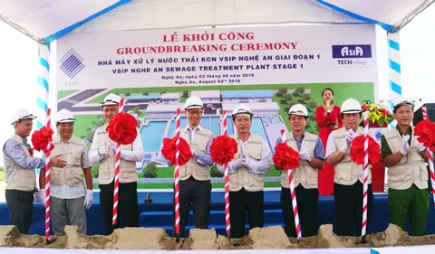 (ĐTTCO) - Ngày 2-8, Công ty TNHH VSIP Nghệ An tổ chức Lễ khởi công xây dựng giai đoạn 1 Nhà máy xử lý nước thải. Đây là một phần quan trọng trong lộ trình thực hiện cam kết của VSIP nhằm mang lại một Khu liên hợp Công nghiệp, Đô thị và Dịch vụ thân thiện với môi trường tại Nghệ An.