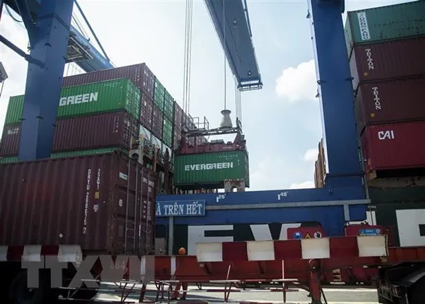 Hoạt động bốc dỡ hàng hóa tại Tân Cảng Cát Lái, thuộc Tân Cảng Sài Gòn. (Ảnh: Hồng Đạt/TTXVN)