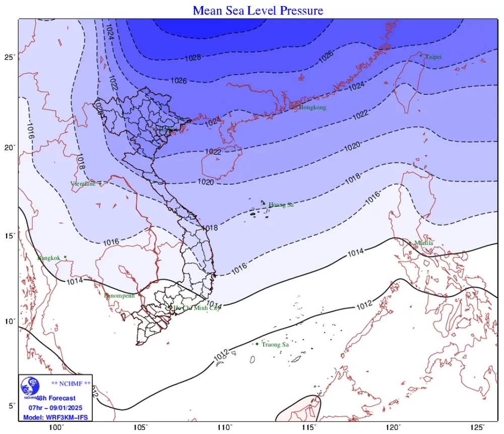 Theo đó, từ khoảng trưa đến tối 9-1, không khí lạnh sẽ bao phủ toàn bộ Bắc bộ, Bắc Trung bộ, sau đó lan rộng đến các nơi khác ở Tây Bắc bộ và Trung Trung bộ. Nhiệt độ tại đồng bằng Bắc bộ và Bắc Trung bộ sẽ giảm sâu, dao động 9-12 độ C, vùng núi phổ biến 6-9 độ C, riêng khu vực núi cao có nơi dưới 5 độ C.