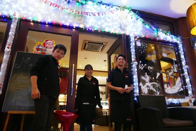 Buổi tối, phố phường lung linh nhờ những trang trí Giáng sinh tại các cửa hiệu. Mặt tiền quán cà phê bên hồ Gươm rực rỡ hơn thường ngày.