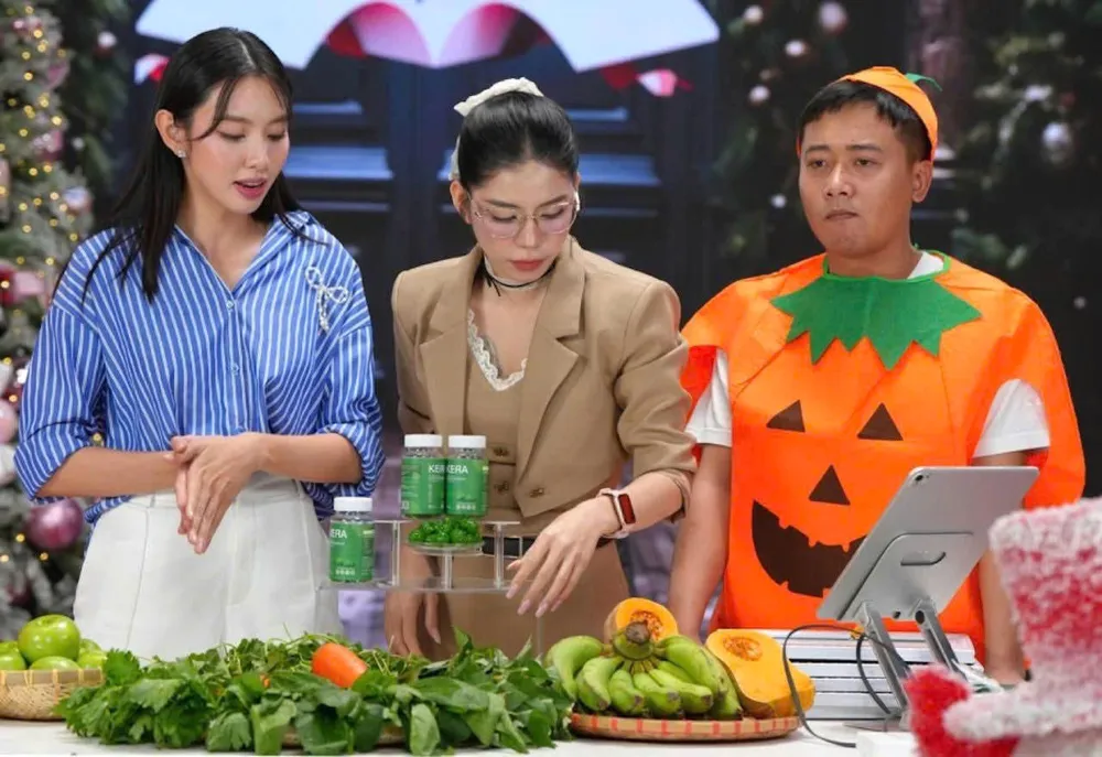 Thùy Tiên - Hằng Du Mục - Quang Linh Vlogs quảng cáo sai sự thật về sản phẩm kẹo rau củ kera. Ảnh: INTERNET
