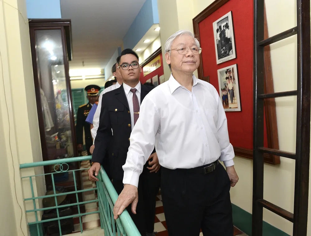 Tổng Bí thư Nguyễn Phú Trọng thăm cơ sở giấu vũ khí của Biệt động thành trong cuộc Tổng tiến công và nổi dậy Xuân Mậu Thân năm 1968. Ảnh: VIỆT DŨNG