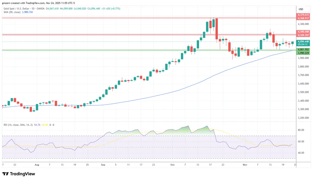 Trong phiên giao dịch đầu tuần, giá vàng (XAU/USD) tăng khoảng 0,80%, dao động trong vùng 4.040-4.100 USD/ounce suốt 4 ngày liên tiếp. Tính đến 6:30 sáng 26-11, vàng giao ngay ở mức 4.130,47 USD/ounce, sau khi có lúc lùi về mức thấp nhất ngày là 4.040 USD/ounce.
