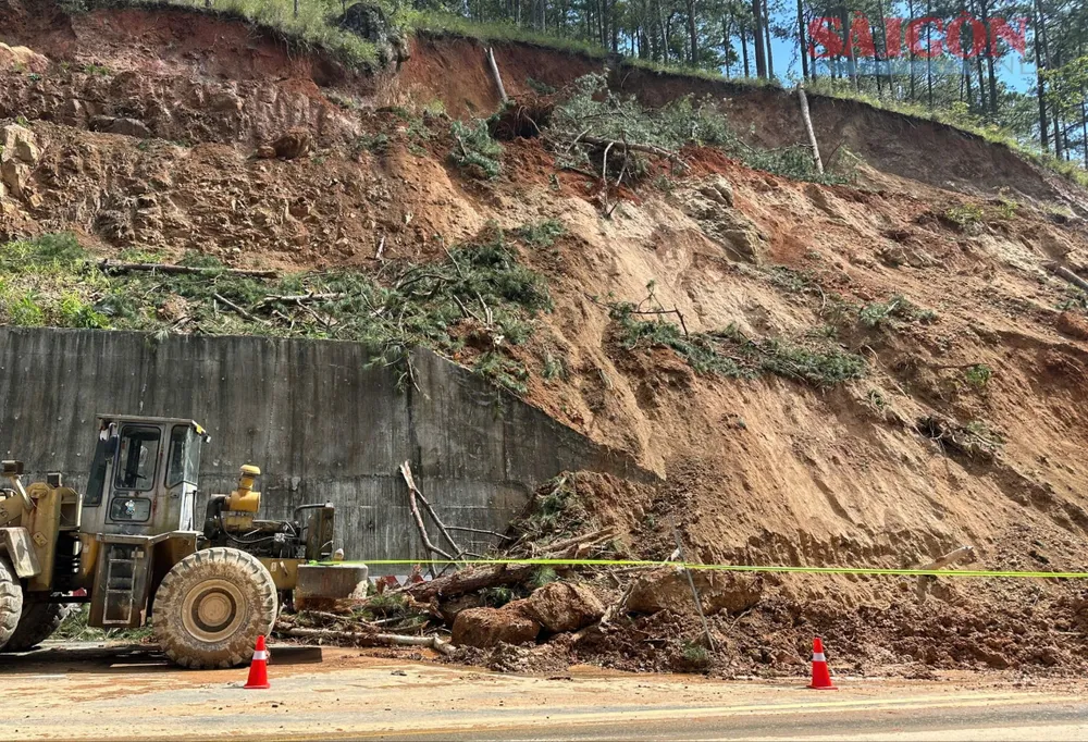 Tại hiện trường, một phần đất đá trong vụ sạt lở trưa 4-12 đã được cơ quan chức năng dọn dẹp khỏi mặt đường, đủ để các phương tiện có thể lưu thông lên xuống đèo Prenn.
