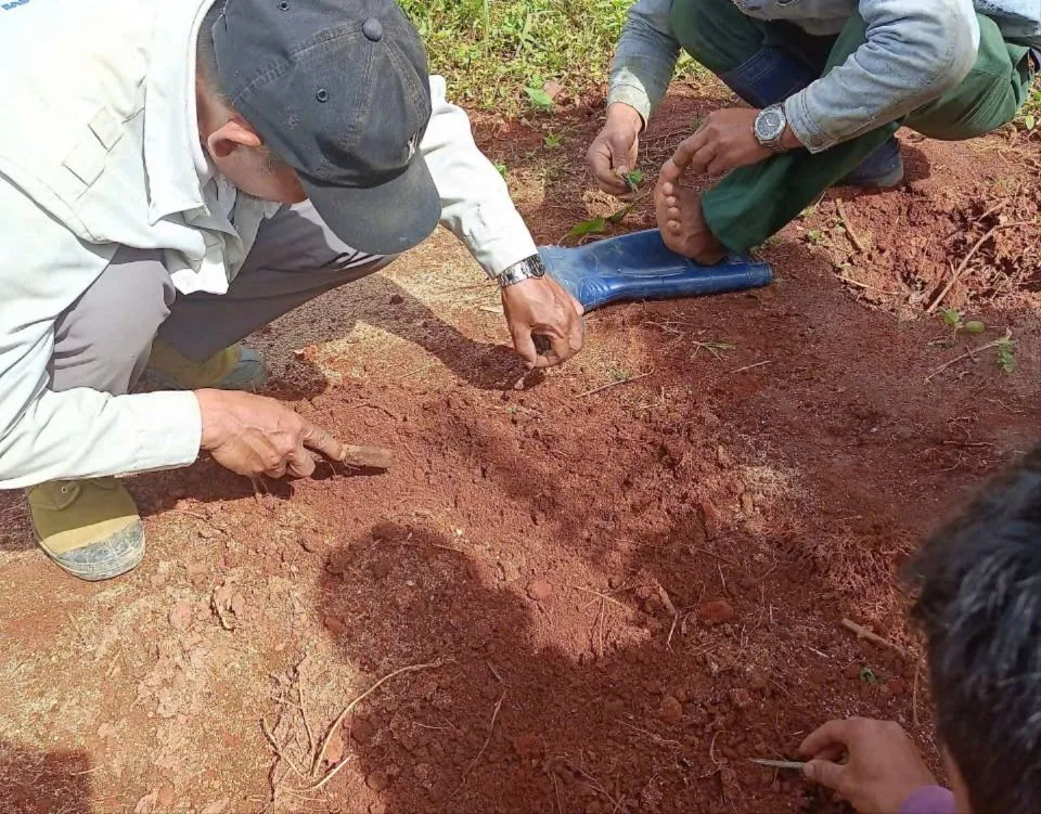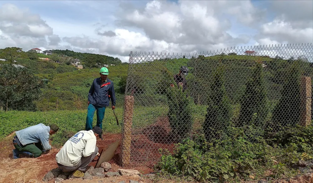Trong quá trình giải tỏa 80 m2 gồm hàng rào và hàng cây tùng thuộc lô a, khoảnh 8, tiểu khu 149B, anh Cil Hoàng Phi Hùng (hộ dân nhận khoán bảo vệ rừng) đã đạp trúng "bẫy kim tiêm" của đối tượng vi phạm chôn dưới đất ngay cổng hàng rào.