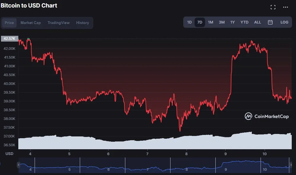 Bitcoin hiện đang giao dịch quanh mức 39.000 USD, giảm 8% so với mức 42.567 USD mà nó đạt bảy ngày trước đó, theo dữ liệu của CoinMarketCap.