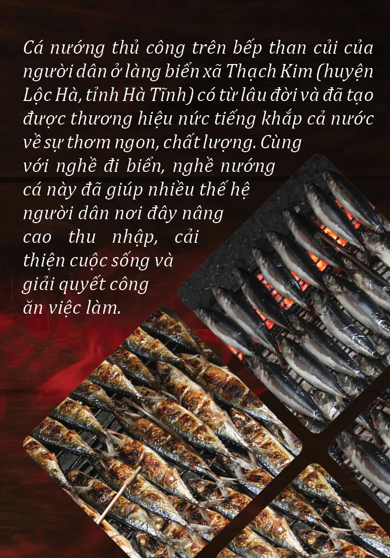 Dịp giáp Tết Nguyên đán, dạo quanh làng biển xã Thạch Kim, mùi cá nướng xen lẫn mùi khói than củi tại các lò nướng cá tập trung ở cụm công nghiệp chế biến hải sản Thạch Kim nức mũi. Tại các lò nướng, hàng chục người đang tất bật làm việc không ngơi nghỉ để kịp đáp ứng sản phẩm cá nướng cho khách hàng trong và ngoài địa bàn tỉnh Hà Tĩnh. Các công đoạn từ chuẩn bị bếp lò, than củi, chọn cá, rửa cá, sắp xếp cá lên vỉ, nướng cá và phơi hong cá đều được mọi người thực hiện một cách chuyên nghiệp.