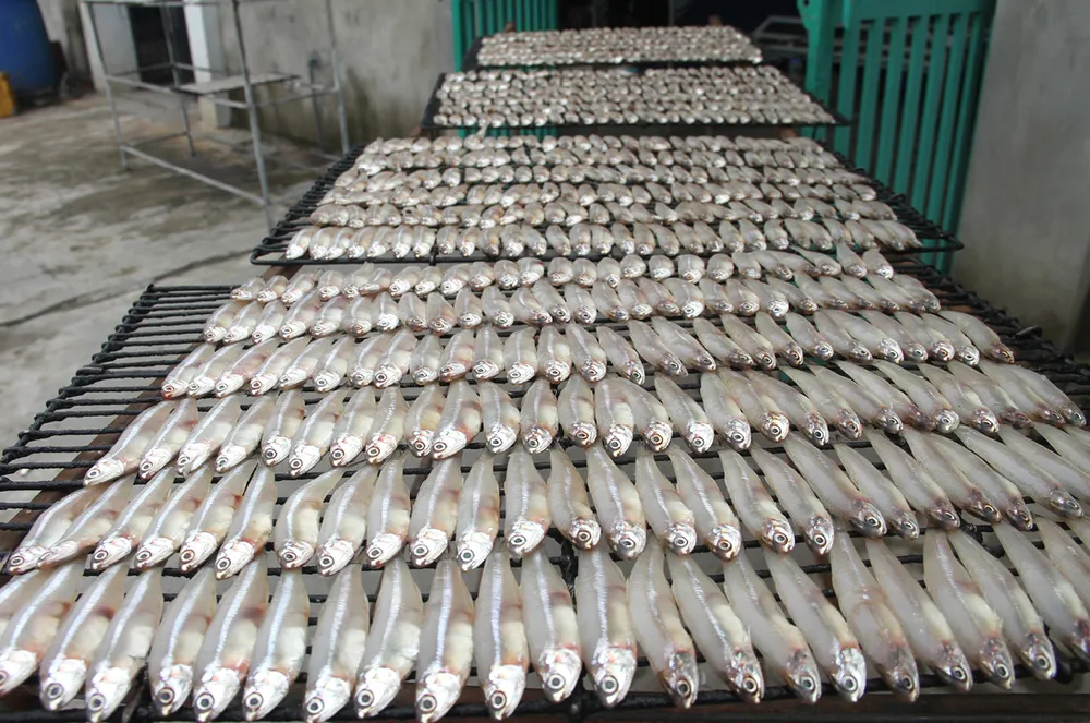 Cá cơm biển được phơi hong trước lúc đưa vào nướng