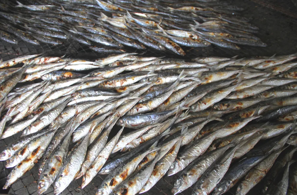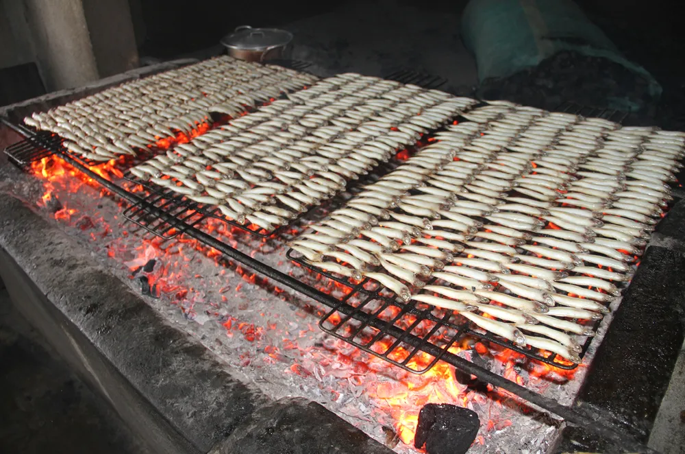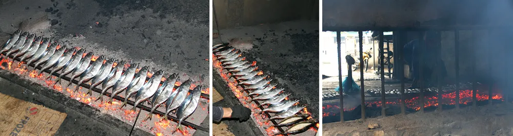 Mẻ cá cơm biển đang nướng trên bếp than củi