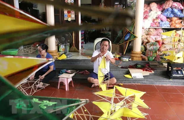 Mỗi người thợ phụ trách một công việc để làm đèn ông sao. (Ảnh: Công Luật/TTXVN)