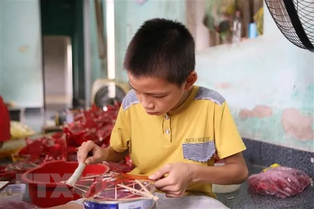 Một em nhỏ tự tay làm chiếc đèn ông sao nhí. (Ảnh: Công Luật/TTXVN)