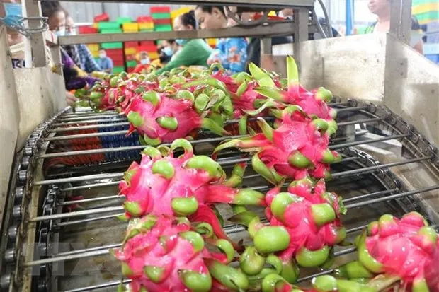 Dây chuyền làm sạch trái thanh long. (Ảnh: Thanh Bình/TTXVN)