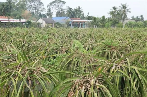 Tiêu thụ khó khăn, nhiều người dân ở Tiền Giang bỏ hoang vườn thanh long. (Ảnh: Bùi Giang/TTXVN)