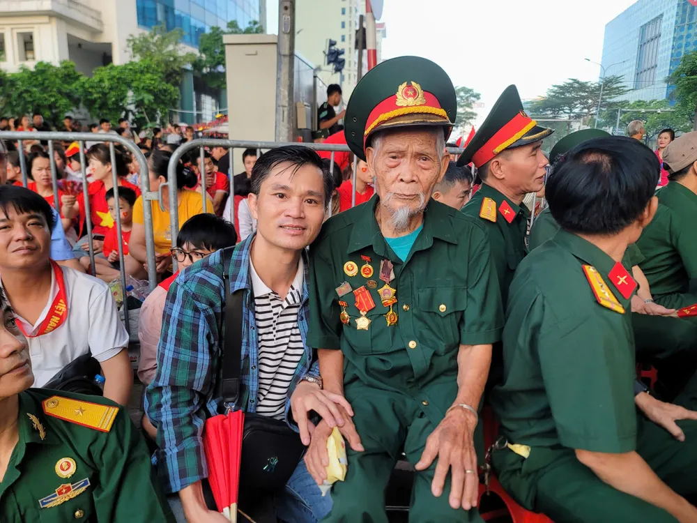 Cụ ông Nguyễn Văn Dị, 103 tuổi, 74 năm tuổi Đảng (tỉnh Phú Thọ), cựu chiến binh Điện Biên Phủ, được cháu đích tôn Nguyễn Văn Tân đưa ra Hà Nội từ đêm 1-9 để xem diễu binh, diễu hành. Ảnh: QUỐC KHÁNH