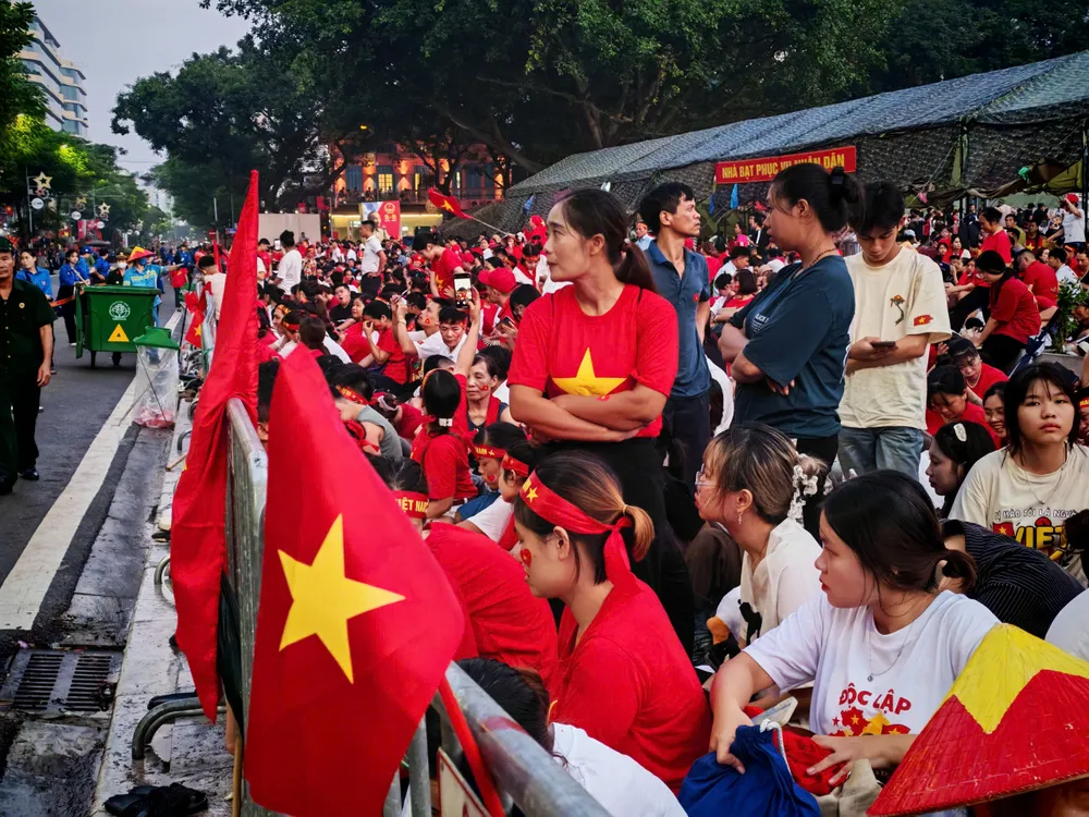 Người dân tập trung ở đường Điện Biên Phủ chờ xem trực thăng mang cờ và biểu diễn của Su-30MK2. Ảnh: TIẾN CƯỜNG
