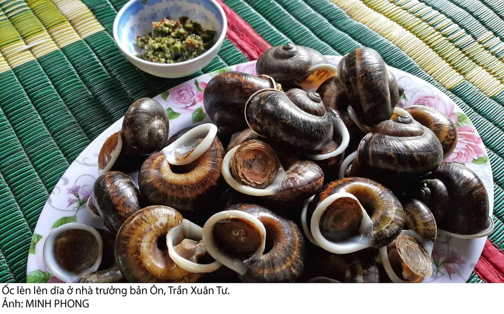 Trưởng bản Ón dặn vợ con vo sạch chỗ ốc quý, thoăn thoắt ra vườn hái ớt chỉ thiên giã muối tươi, đâm hạt dỗi thơm lừng làm món chấm đãi khách. Đến bữa, ông Tư nói: “Hôm nay có món ốc, trước là cúng Giàng, báo cáo Giàng có khách quý lên chơi mới mời món ốc lèn, sau cũng thấy yên lành vì năm nay ốc lèn cũng khá, chứng tỏ vùng đất đồng bào Rục ở vẫn giữ nếp bình yên, con cháu thuận hòa, mùa vụ tươi tốt”.