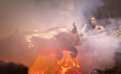 Thời gian nướng từ 3 đến 4 tiếng. Lợn quay trên lửa phải được xoay liên tục, đều tay để lớp bì giòn đều. Mùi gỗ và vỏ dừa thơm sẽ quyện vào thịt mang đến hương vị đặc trưng khó quên.