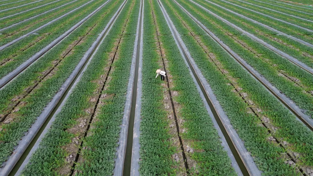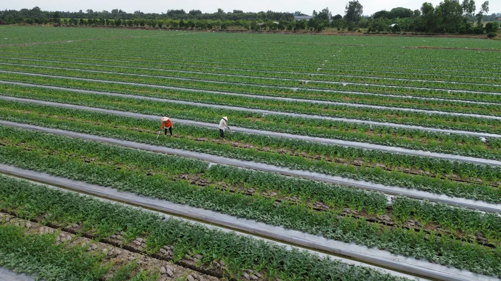 Người dân chăm sóc ruộng dưa hấu tại huyện Tân Thạnh