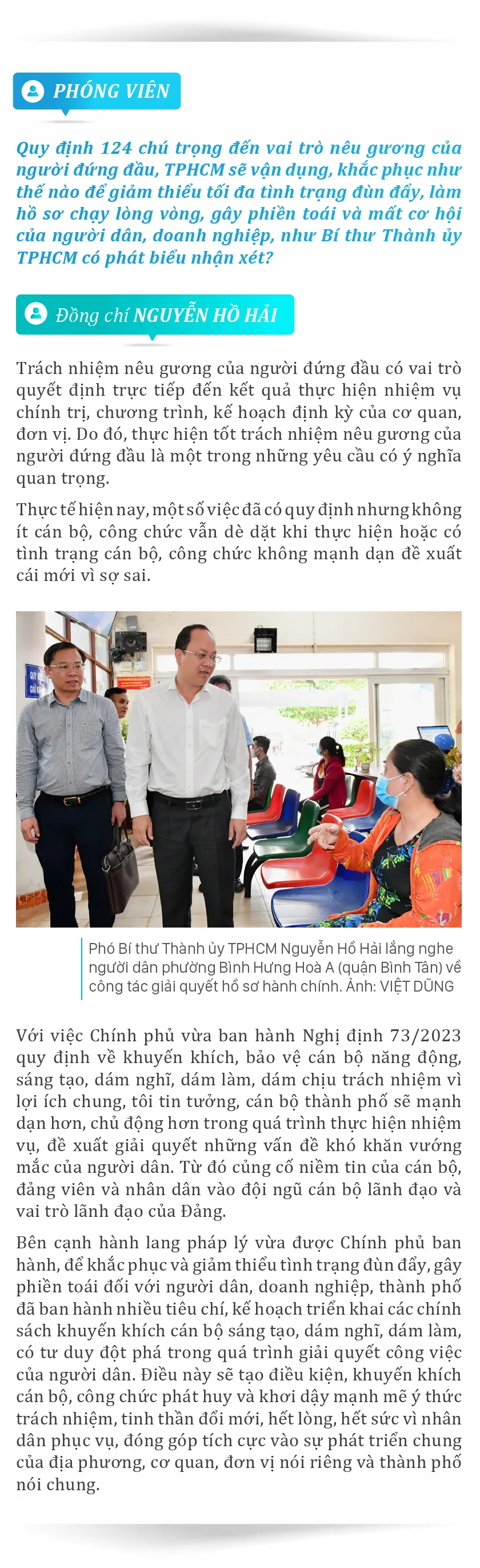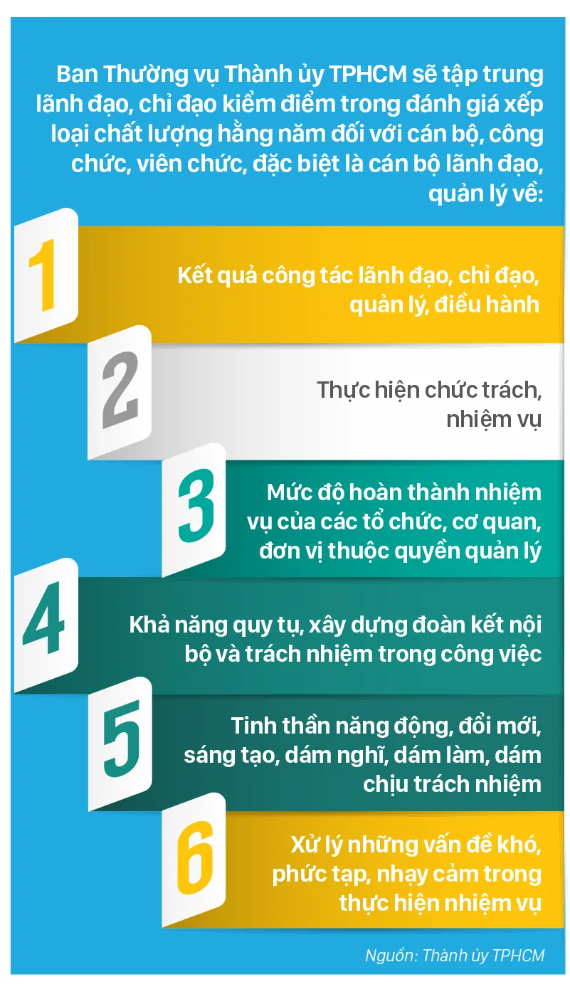 Đến nay, bên cạnh việc quán triệt, triển khai thực hiện Kết luận 14 của Bộ Chính trị, Thành ủy TPHCM đã yêu cầu các cơ quan có liên quan tham mưu công tác đánh giá cán bộ phải lượng hóa được tất cả các tiêu chuẩn đánh giá cán bộ hằng năm, để đánh giá cán bộ thực chất, toàn diện. Trong đó, có quy định cụ thể trách nhiệm của người đứng đầu trong việc động viên, khơi nguồn sức sáng tạo tại cơ quan, đơn vị, địa phương mình.