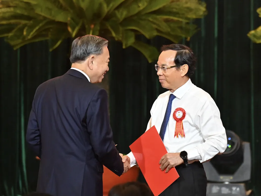 Tổng Bí thư, Chủ tịch nước Tô Lâm và Bí thư Thành ủy TPHCM Nguyễn Văn Nên. Ảnh: VIỆT DŨNG