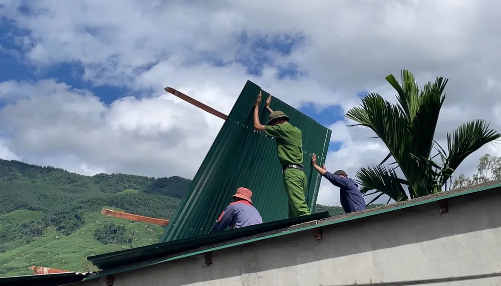 Các lực lượng xã Đông Trà Bồng đang lợp nhà giúp dân. Ảnh: C.A ĐÔNG TRÀ BỒNG