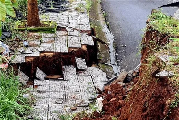 Sạt trượt trên Đường Hồ Chí Minh, đoạn qua phường Nghĩa Thành, thành phố Gia Nghĩa (Đắk Nông), tháng 8/2023. (Ảnh: Hưng Thịnh/TTXVN)