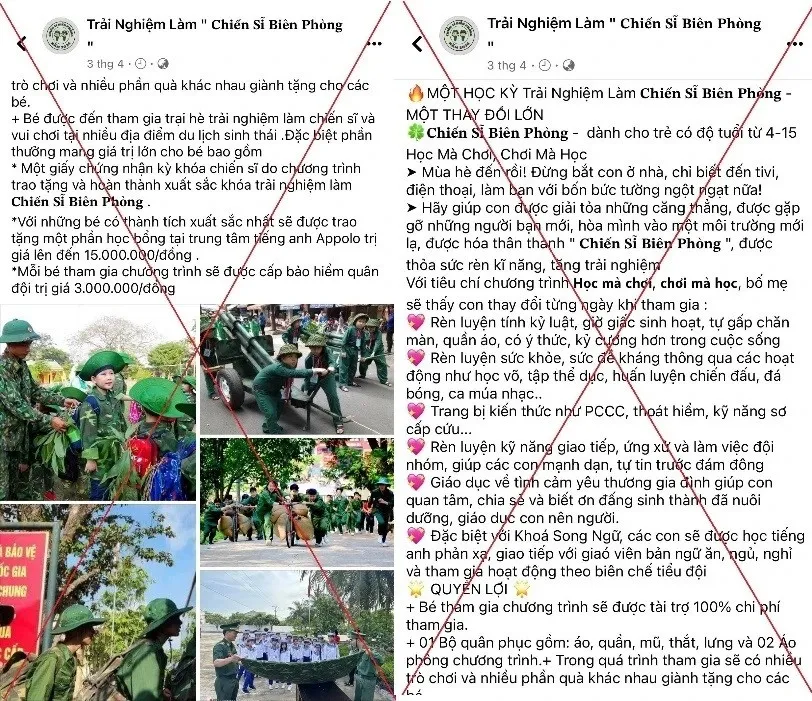 Đã có trường hợp một phụ huynh ở Hà Nội bị lừa 600 triệu đồng khi đăng ký cho con tham gia "Trại hè Chiến sĩ Biên phòng" trên Facebook. Ngày 9/5, Công an thành phố Hà Nội thông báo một phụ nữ ở quận Hoàng Mai đã bị lừa hơn 1 tỷ đồng khi đăng ký "trại hè quân đội nhí" cho con trên Facebook. Nạn nhân là chị M., đang tìm kiếm khóa học hè cho con và thấy nhiều quảng cáo về "Học kỳ trong quân đội 2024" trên các fanpage.