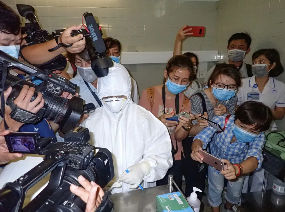 Báo chí tác nghiệp tại buổi tập huấn tuyên truyền phòng chống dịch Covid-19 ở Bệnh viện Thống Nhất, TPHCM. Ảnh: Hoàng Hùng