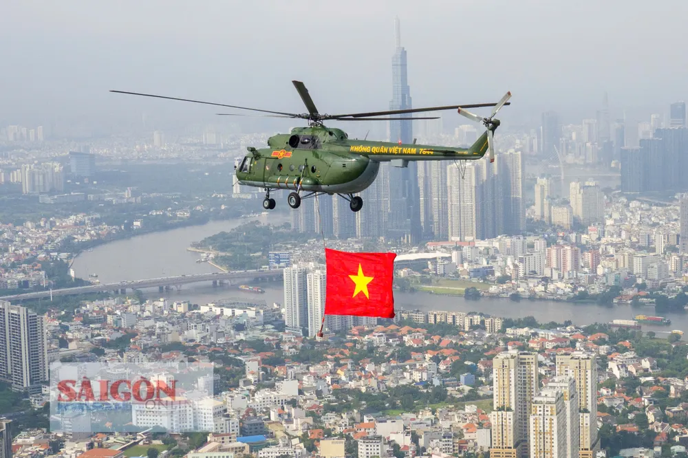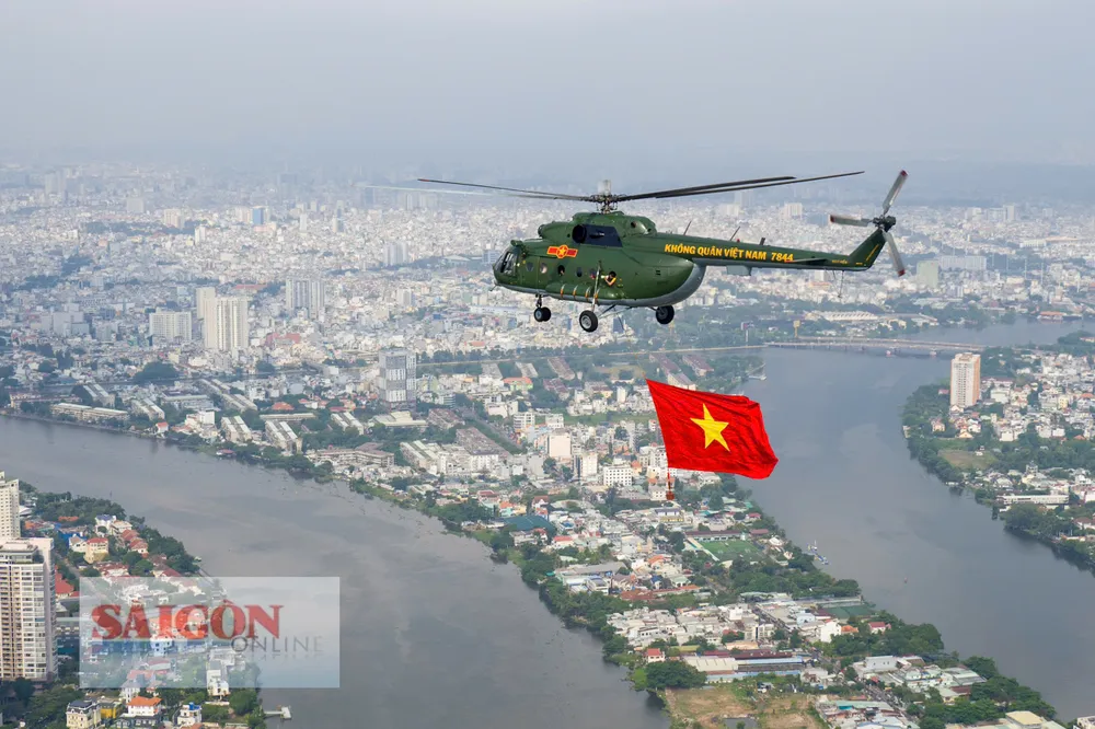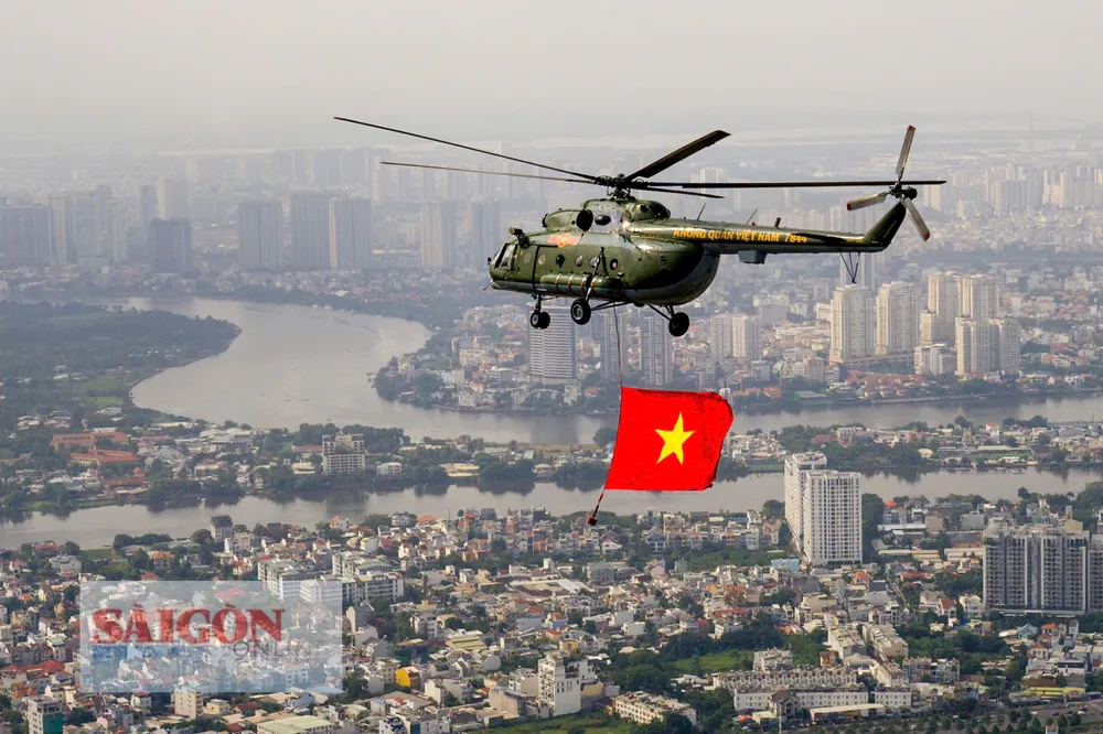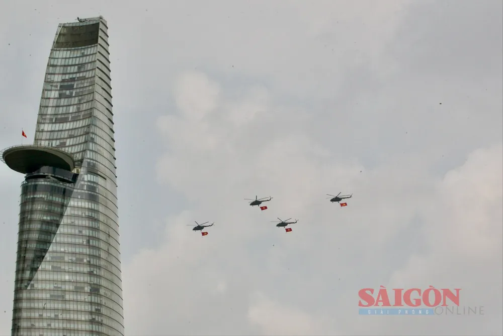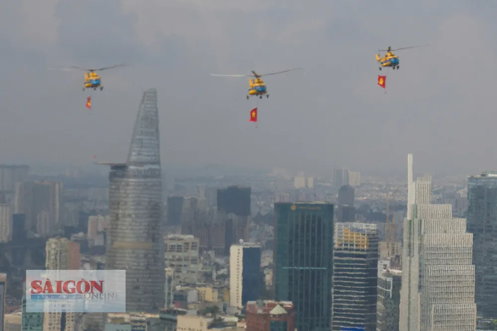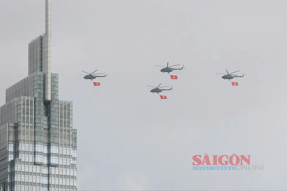 Đúng 8 giờ 30 phút, phi đội trực thăng bắt đầu cất cánh và tiến về TPHCM theo đội hình 3-4-3. Sau khoảng 30 phút bay, lá cờ Đảng, cờ Tổ quốc đã tung bay trên bầu trời Thành phố mang tên Bác, làm “nức lòng” người dân thành phố.
