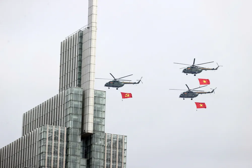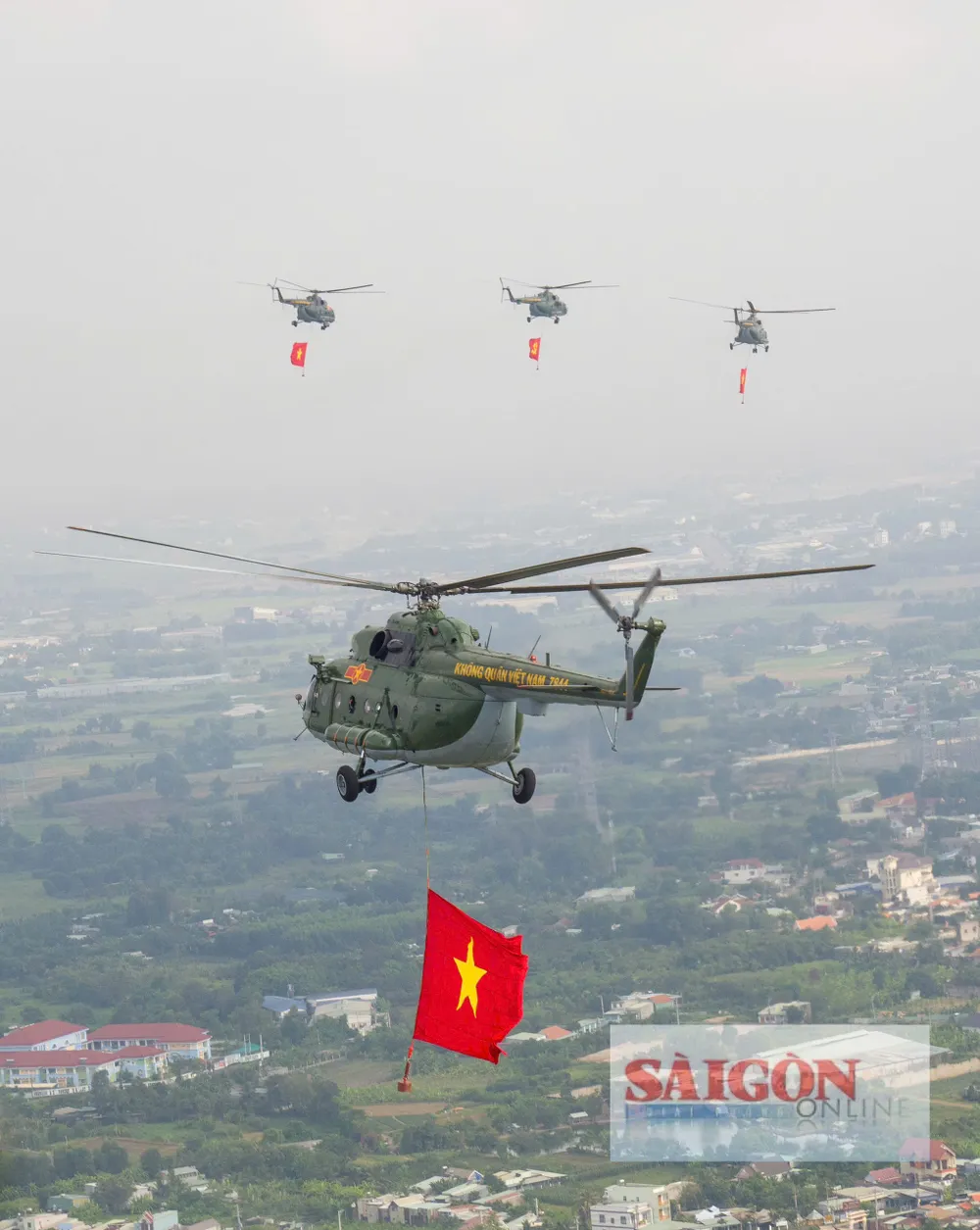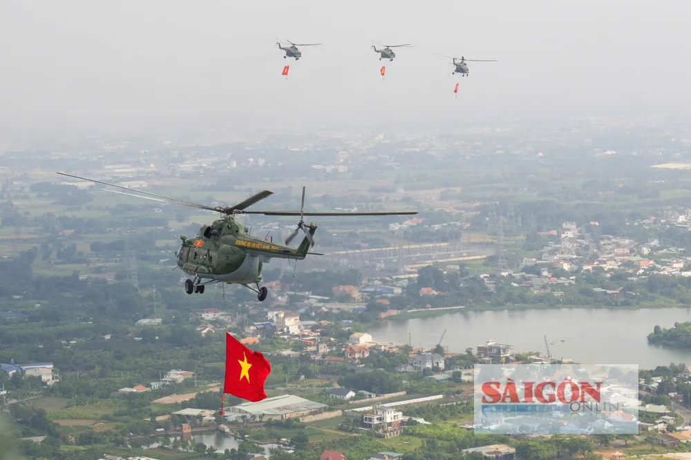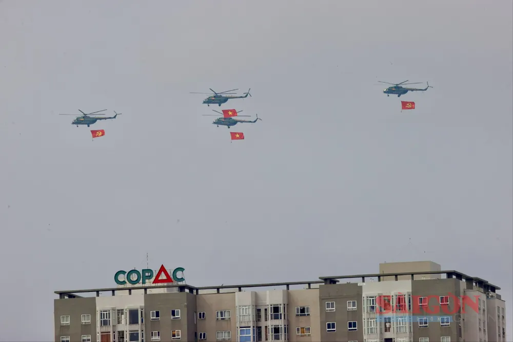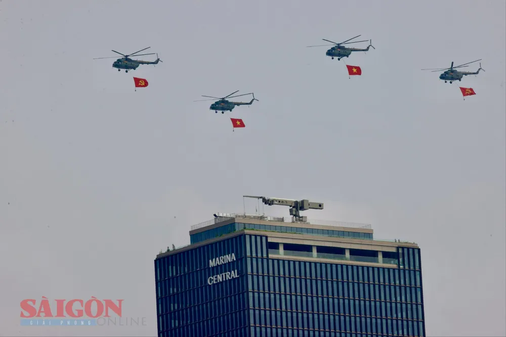 Đúng 8 giờ 30 phút, phi đội trực thăng bắt đầu cất cánh và tiến về TPHCM theo đội hình 3-4-3. Sau khoảng 30 phút bay, lá cờ Đảng, cờ Tổ quốc đã tung bay trên bầu trời Thành phố mang tên Bác, làm “nức lòng” người dân thành phố.